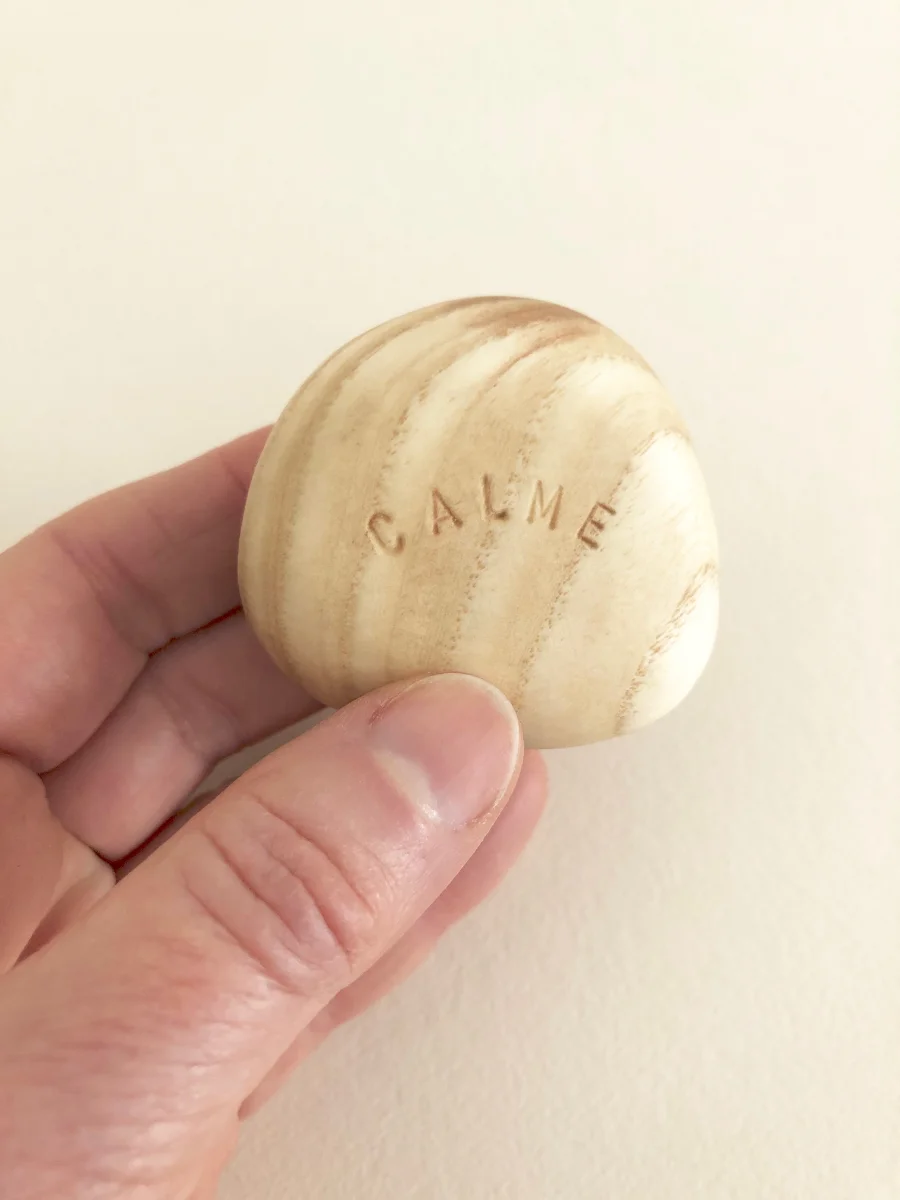 Chaque galet est une pièce unique réalisée dans l’intention du mot qu’il porte.