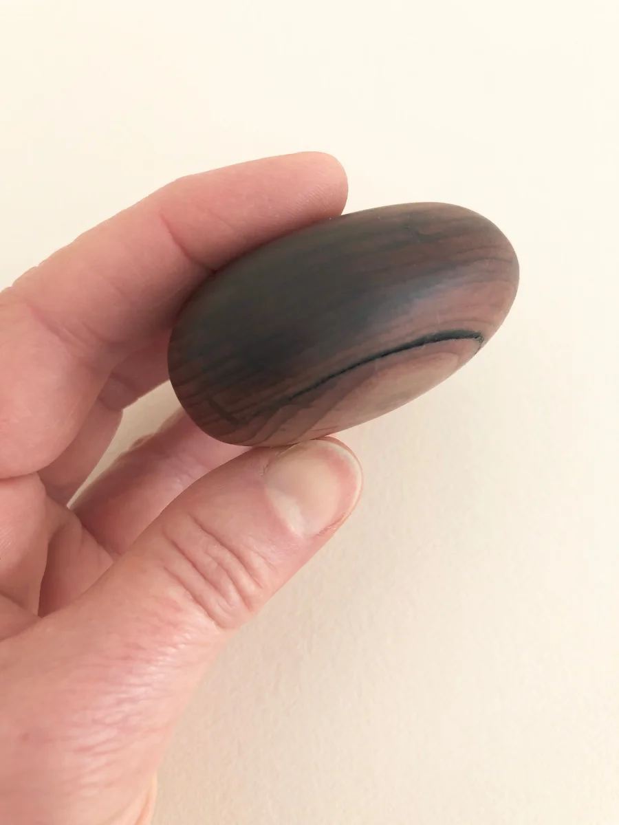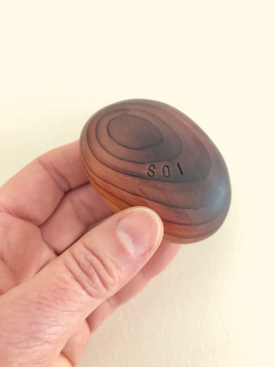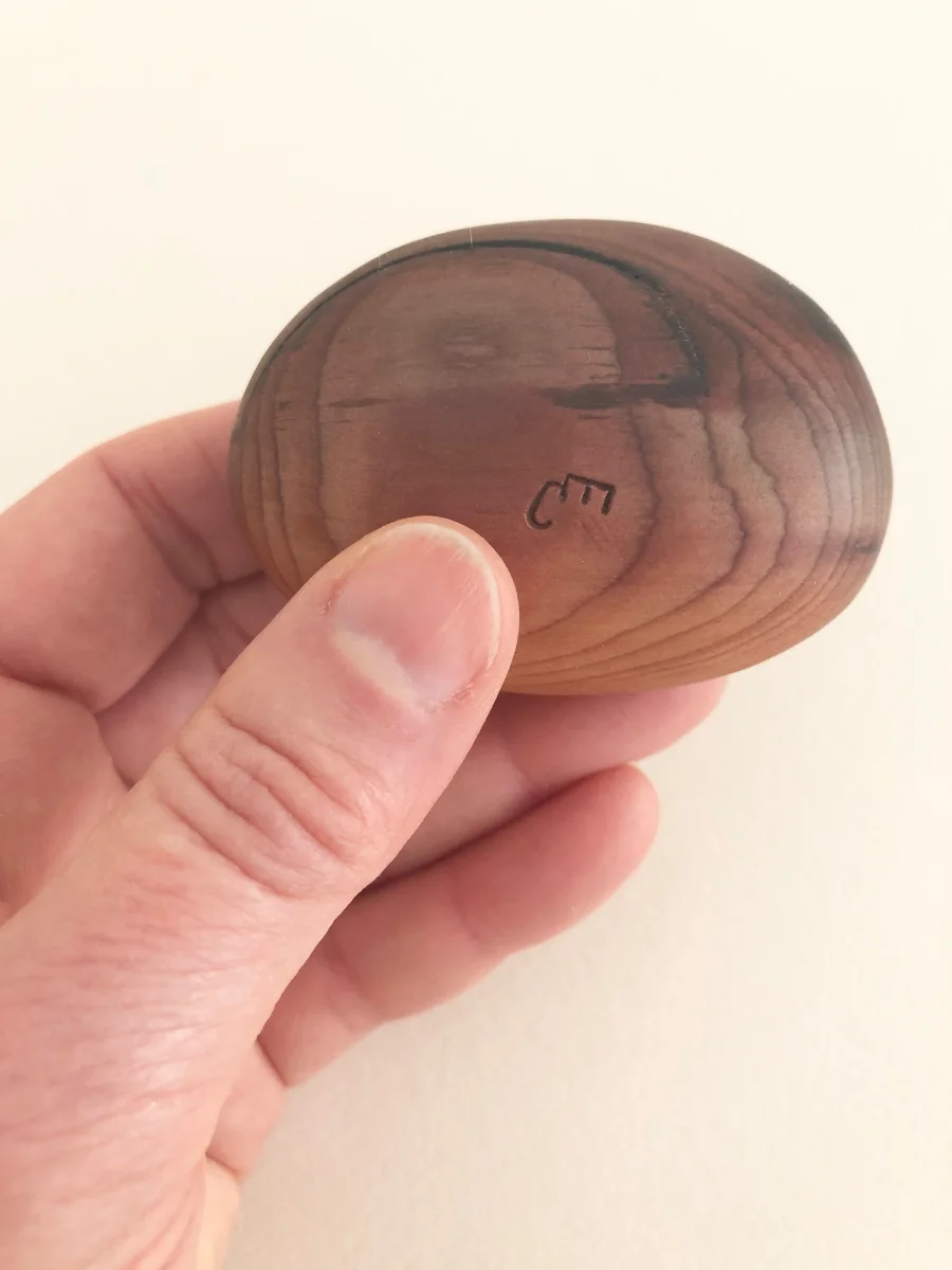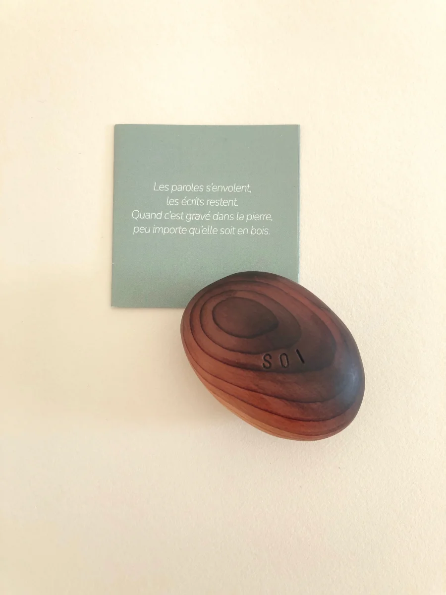 Chaque galet est livré emballé dans un petit sac en coton accompagné de son certificat qui rappelle l’essence de bois et ma démarche.